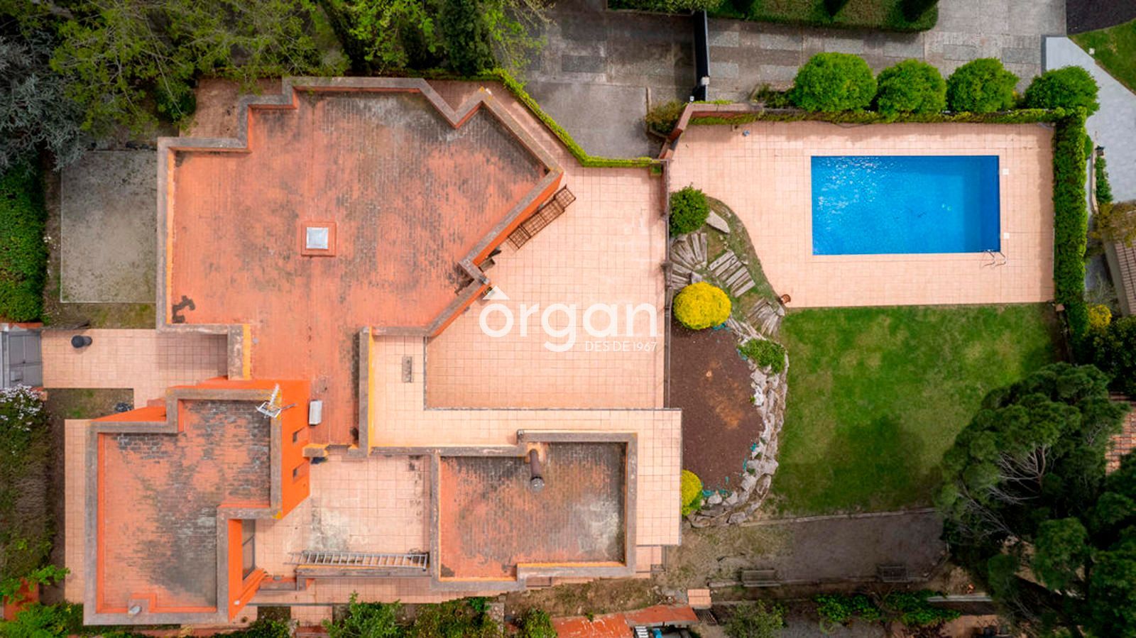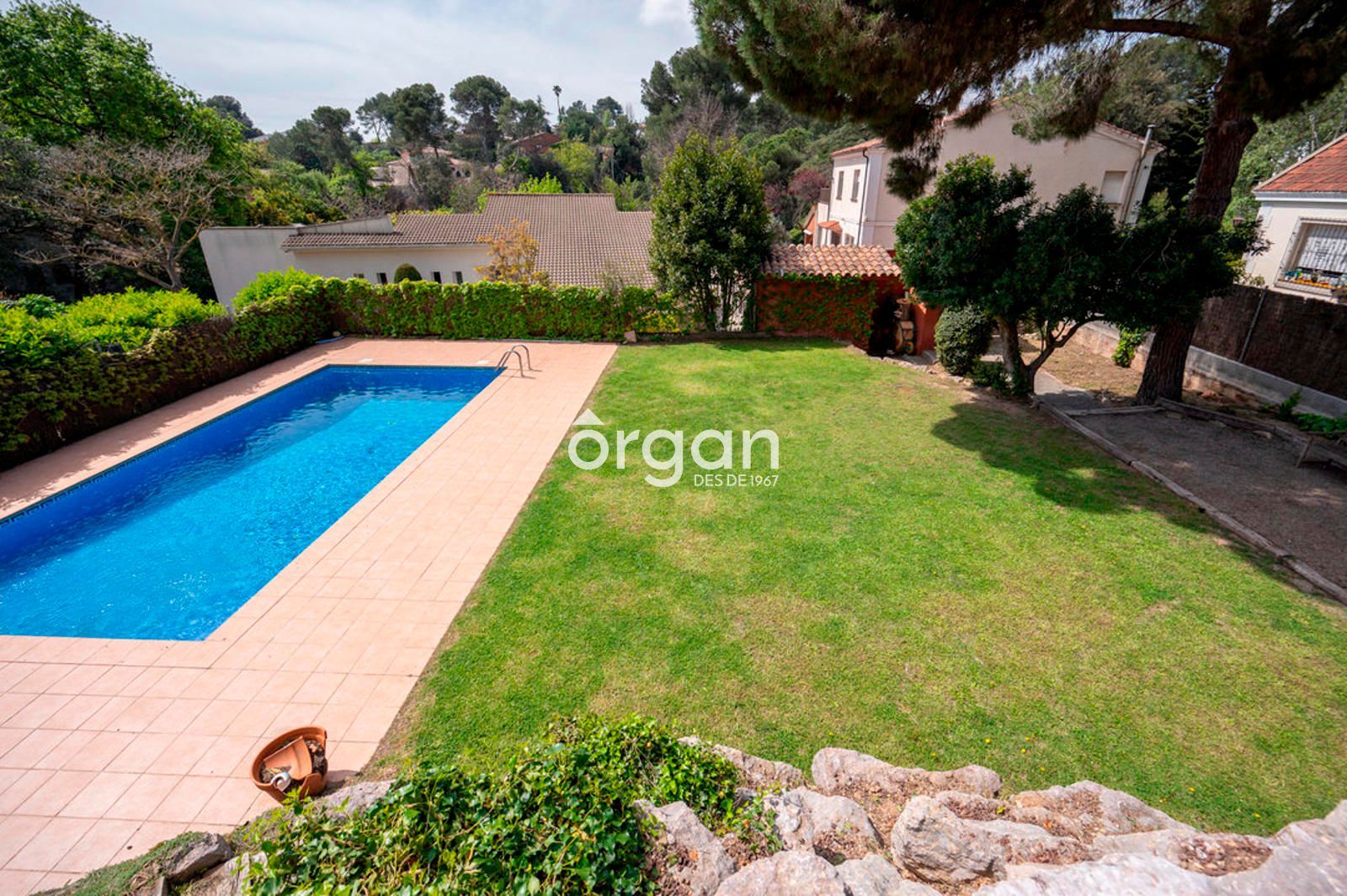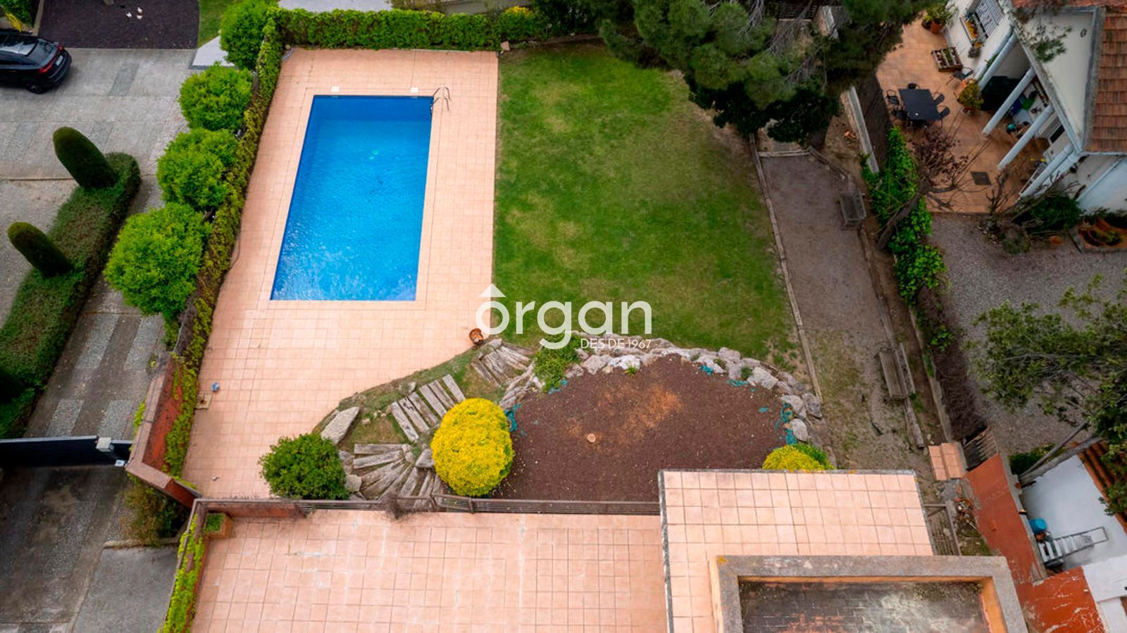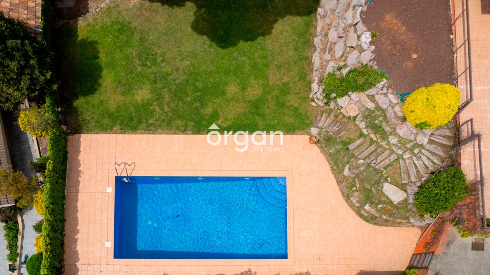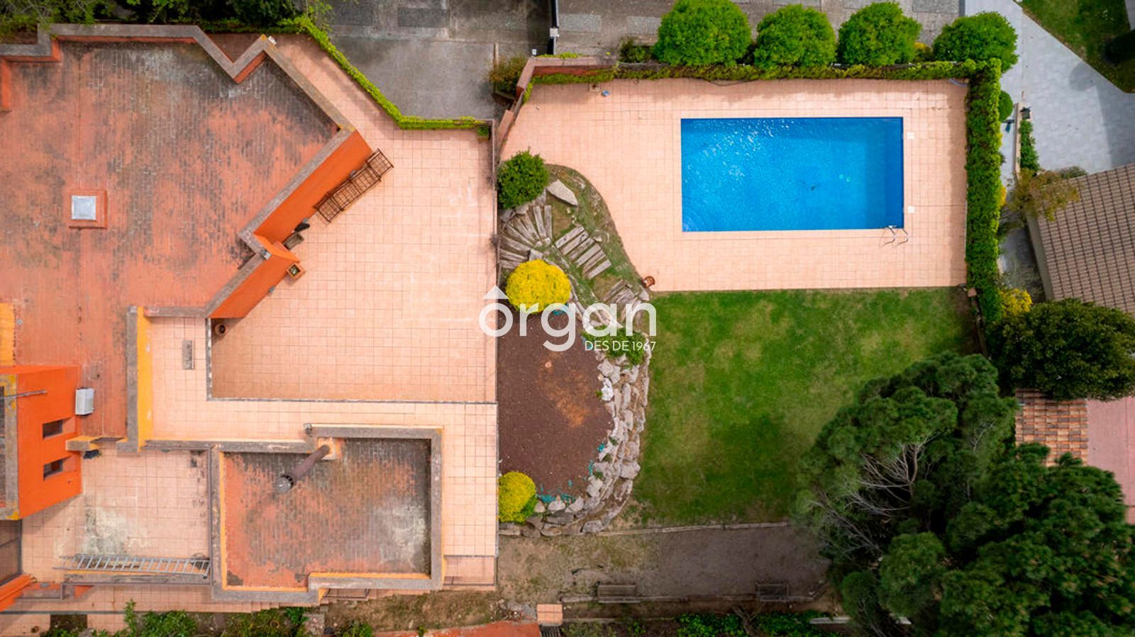 En el exterior encontrarás una gran zona de terraza, otra ajardinada con césped natural, una piscina privada y un vestuario con lavabo situado junto a la piscina, perfecto para disfrutar al aire libre sin necesidad de entrar en la vivienda.